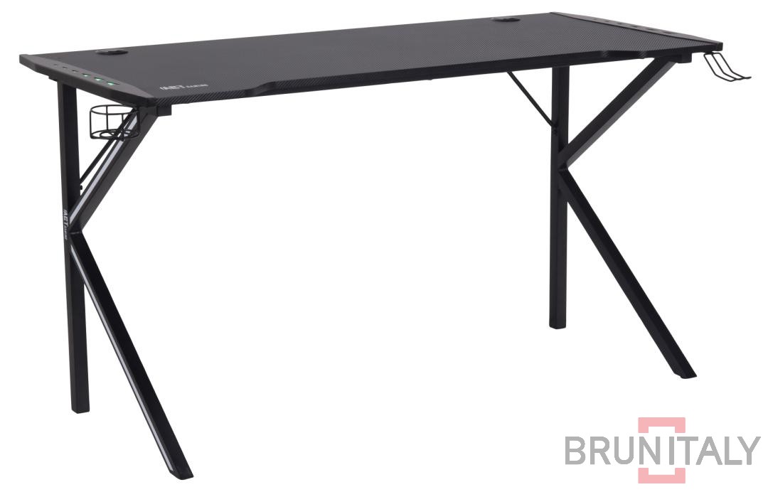 Scrivania da gioco rettangolare ninja, melamina ruvida in carbonio top, metallo a polvere nera matto di base, con supporto a LED, supporto per tazza, gancio per cuffie e foro del filo, 140x60x75 cm