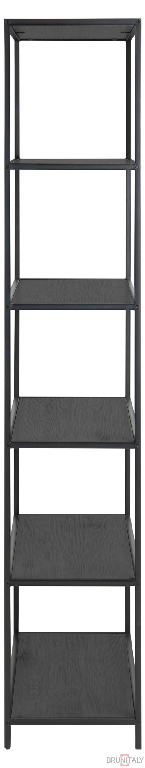 Seaford Bookcase, cornice e base Matt Black Ruggy Powder Polved Metal, 5 ripiani melamina ruvida nera, 77x35x185 cm