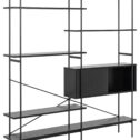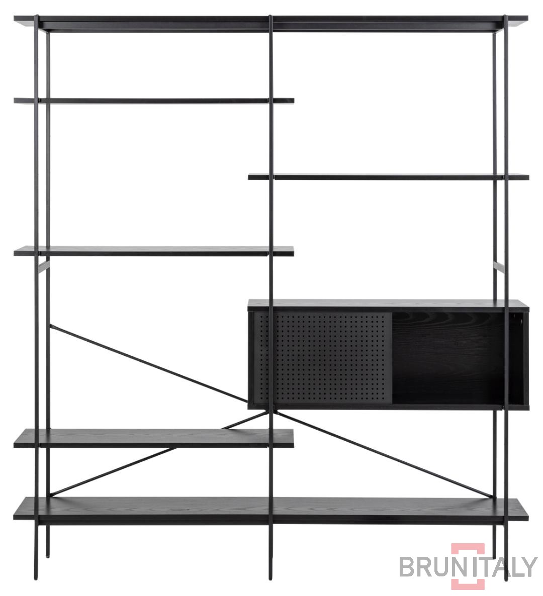 Libreria Angus, telaio, porta e base matto matto di metallo rivestito in polvere ruvido, 5 ripiani melamina ruvida nera, con dettagli asimmetrici, maglia metallica e porta scorrevole, 172x27x188 cm
