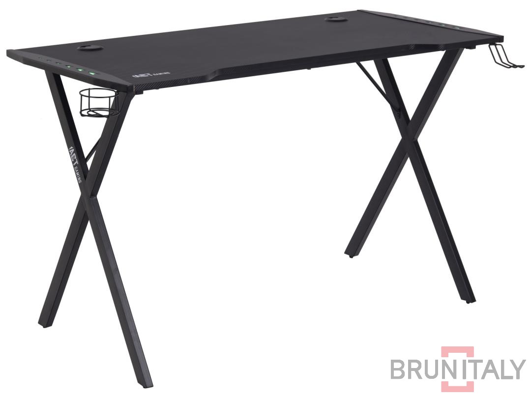 Scrivania da gioco rettangolare Elijah, melamina ruvida in carbonio, metallo rivestito in polvere nera Matt a croce, con PED, porta a tazza, gancio per cuffie e foro del filo, 120x60x75 cm