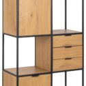 Libreria, telaio e base di Swindones in metallo rivestito in polvere ruvida nera, 2 porte, 3 cassetti e 4 ripiani di carta ruvida in quercia selvatica, con dettagli asimmetrici e corridori in metallo, 85x40x183 cm